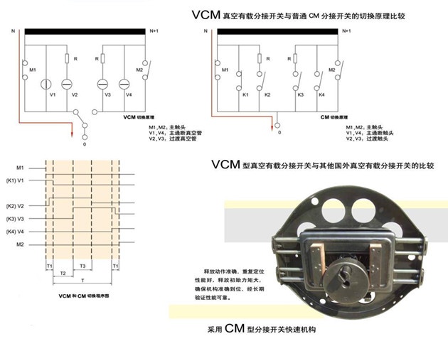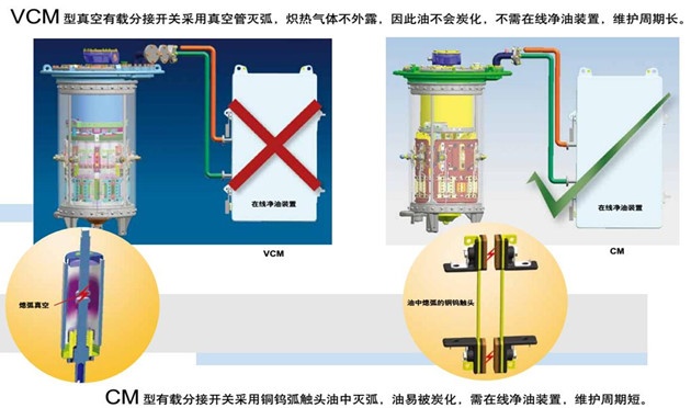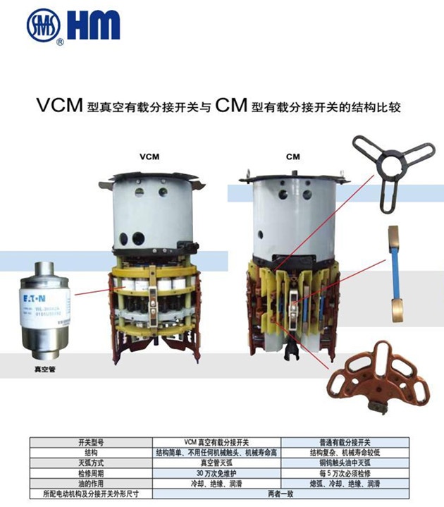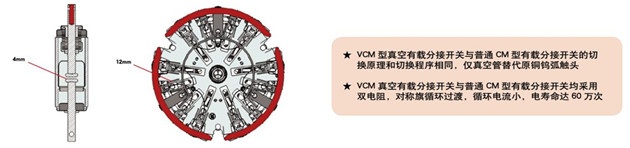 VCM型真空開關(guān)的真空管開距4mm,而CM型開關(guān)觸頭開距為12mm,因此,VCM型分接開關(guān)切換過程中機(jī)械沖擊小,觸頭開斷機(jī)械能量小,機(jī)械壽命大幅提高。